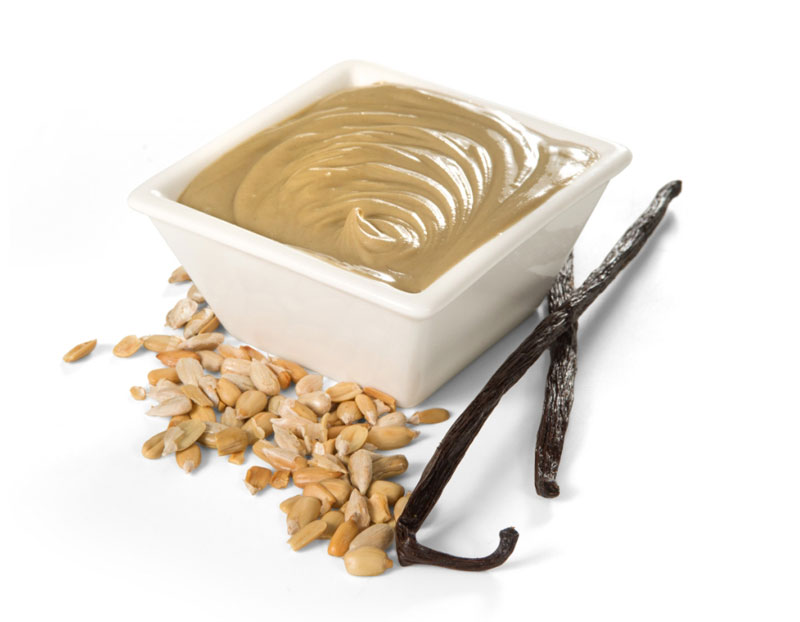 Халвова начинка має яскравий, насичений аромат смаженого насіння, що додає їй особливого тепла і глибини. Відтінок ніжної ванілі доповнює її смакову гармонію. Мʼяка і легка текстура легко розподіляється і зручна у роботі, що робить її ідеальною для використання. Відмінно поєднується з пісочним, цукровим печивом та хлібобулочними вироби.